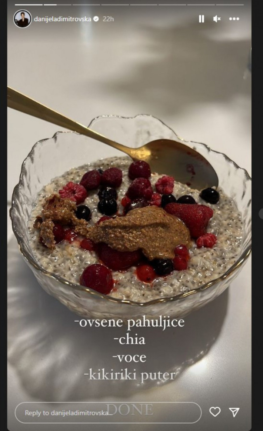 Doručak Danijele Dimitrovske sastoji se od ovsenih pahuljica, čija semenki, svežeg voća i kikiriki putera. Ako izbacite poslednji sastojak, ovaj brzi recept idealan je i za gubljenje suvišnih kilograma.