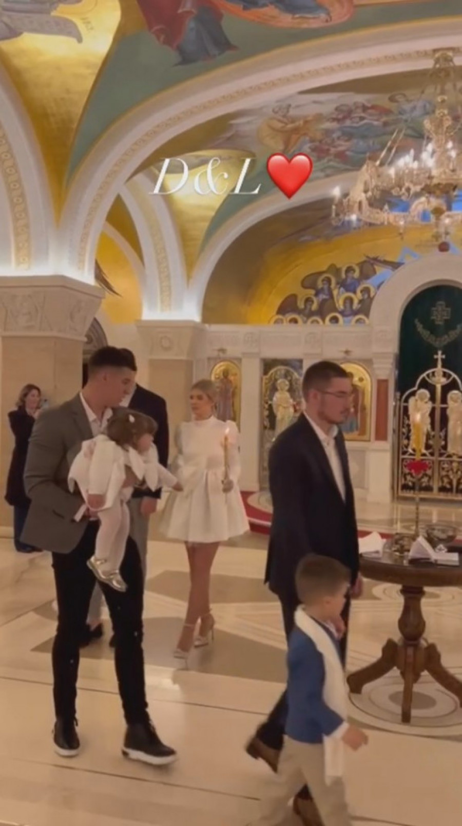 Mala slavljenica blistala je u svečanoj beloj haljinici. Sličnu kreaciju imala je i njena mama, dok se Nemanja odlučio za sivo odelo i teget rolku.