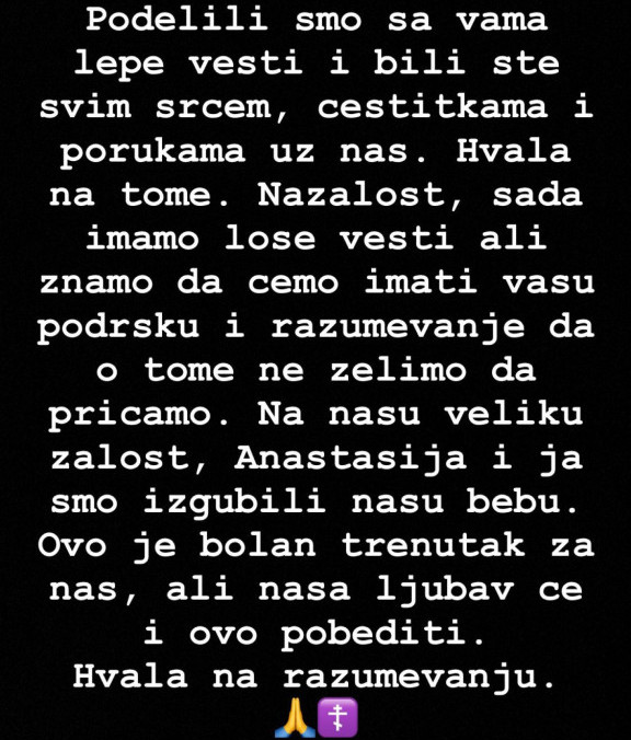“Podelili smo sa vama lepe vesti i bili ste svim srcem, čestitkama i porukama uz nas. Nažalost, sada imamo loše vesti, ali znamo da ćemo imati vašu podršku i razumevanje da o tome ne želimo da pričamo. Na našu veliku žalost, Anastasija i ja smo izgubli našu bebu. Ovo je bolan trenutak za nas, ali naša ljubav će i ovo pobediti. Hvala na razumevanju.”