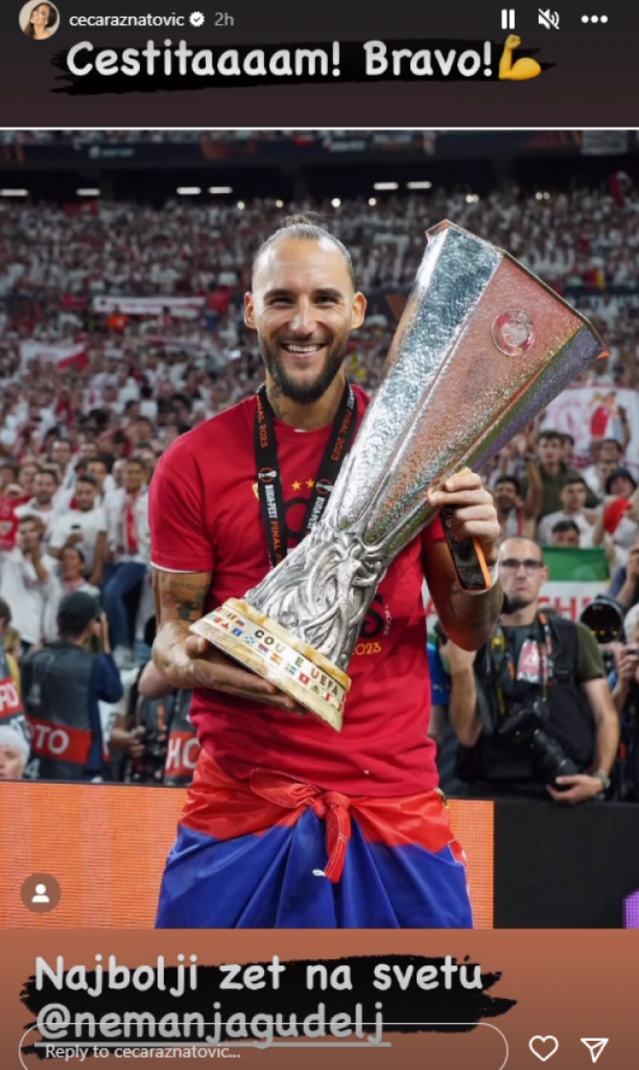 Ceca je na Instagramu objavila Nemanjinu sliku sa peharom, i radovala se neverovatnom uspehu koji je njegov tim postigao.