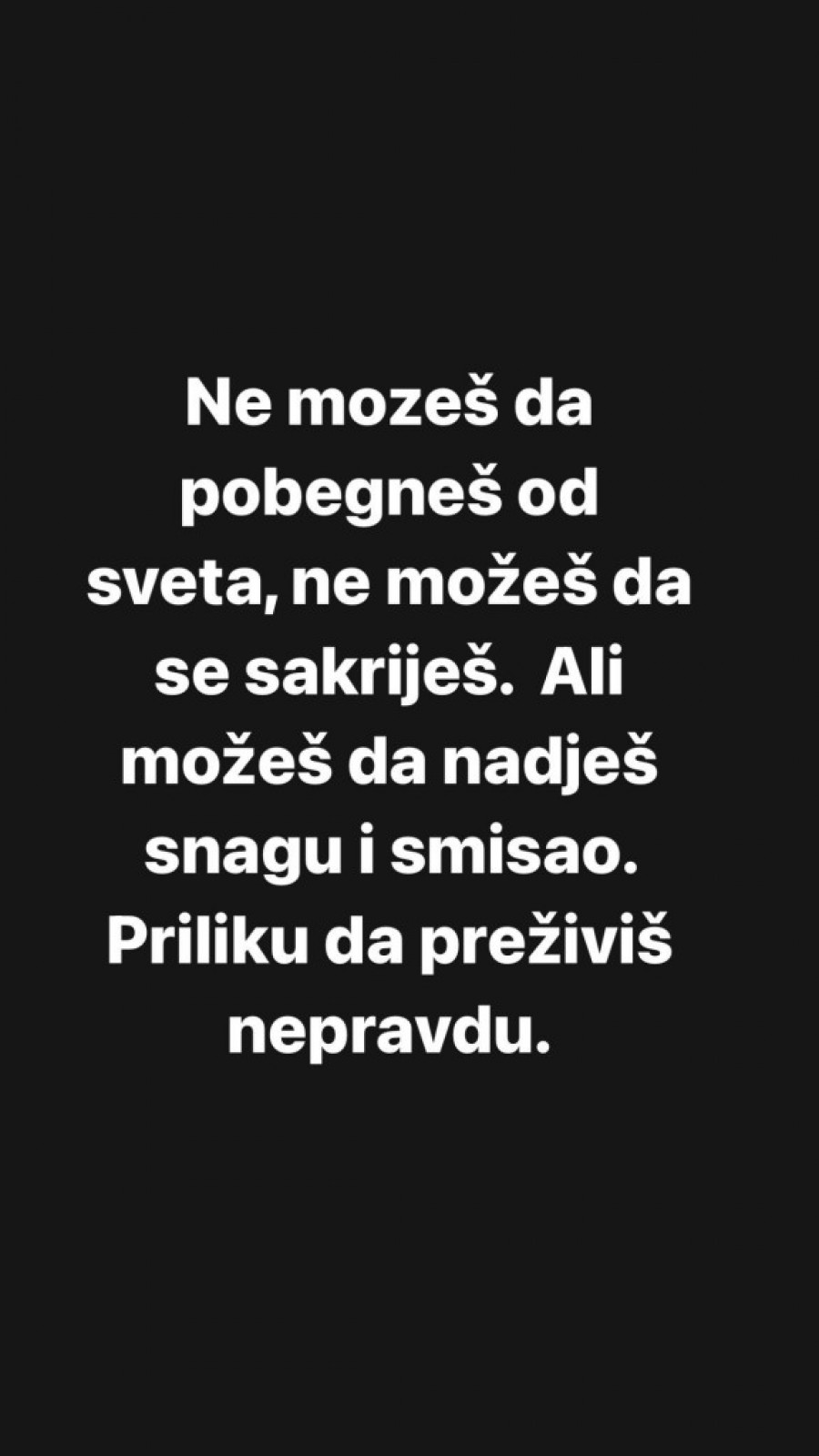 „Ne možeš da pobegneš od sveta, ne možeš da se sakriješ. Ali možeš da nađeš snagu i smisao. Priliku da preživiš nepravdu.“