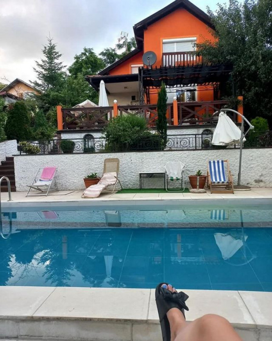 Osim po brižljivo uređenom dvorištu, imanje se izdvaja i po tome što ima veliki bazen pored koga su, kao u najbolje opremljenim hotelima, smeštene udobne ležaljke. Mesta za odmor ima i na velikoj terasi, gde se nalazi udobna garnitura sa ukrasima od kovanog gvožđa.