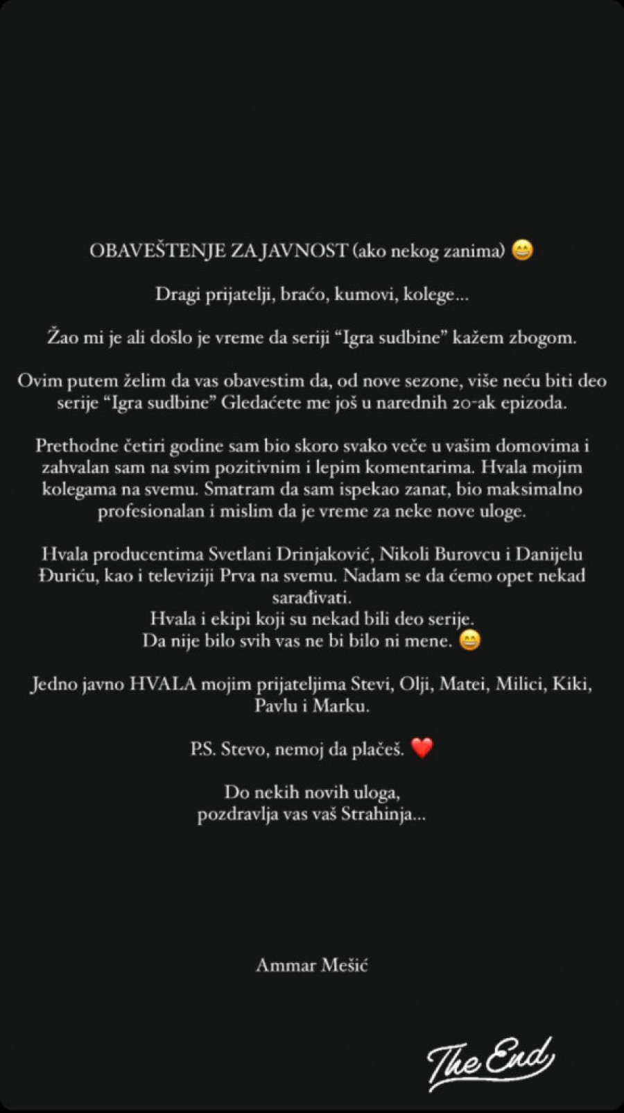 – Dragi prijatelji, braćo, kumovi. Žao mi je ali je došlo vreme da seriji "Igra sudbine" kažem zbogom. Ovim putem želim da vas obavestim, da, od nove sezone, više neću biti deo serije "Igra sudbine". Gledacete me jos u narednih 20-ak epizoda – počeo je objavu Ammar Mešić.