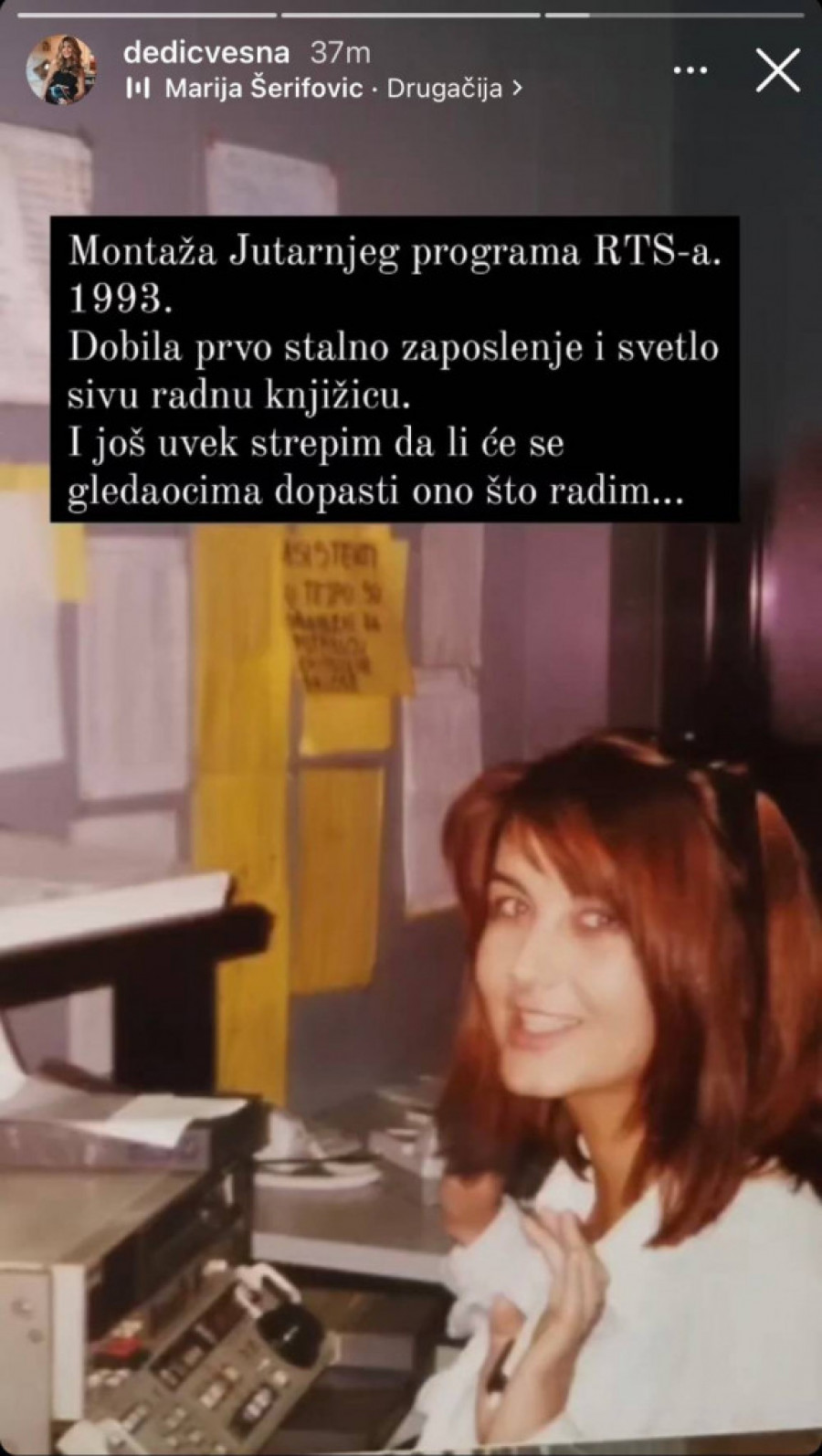 „Montaža Jutarnjeg programa RTS-a, 1993. godina. Dobila prvo stalno zaposlenje i svetlosivu radnu knjižicu. I još uvek strepim da li će se gledaocima dopasti ono što radim”, napisala je uz fotografiju.