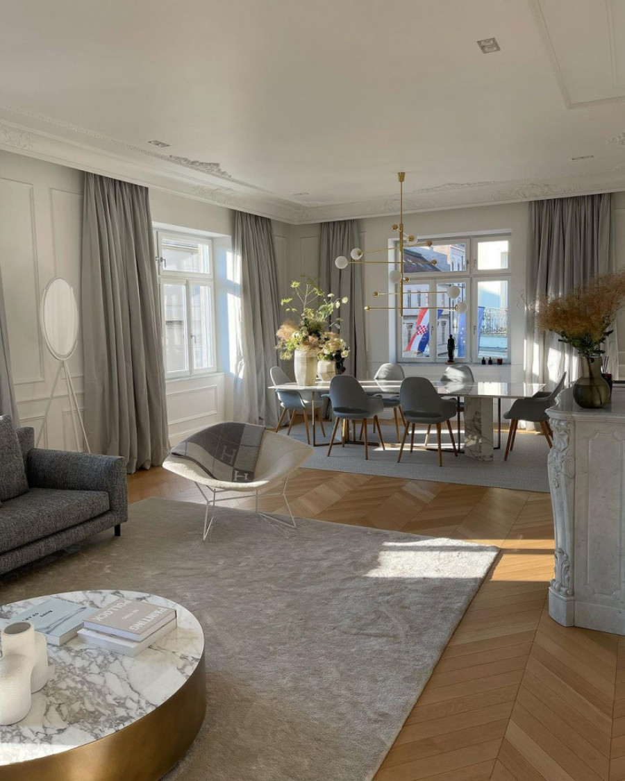 Dominira moderan stil, sa belim i sivim tonovima. Prostorija je osvetljena sa dve strane, ima bele zidove, parket širokih dimenzija, tamnosivi kauč i zavese u svetlijoj nijansi, okrugli sto gornjim delom od mermera, veliki televizor, kamin, cvetni ukrasi...