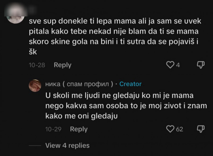 Jedan od poslednjih napada dogodio se na TikToku, gde je Nika prava zvezda. Jedan uvredljivi komentar upućen devojčici glasio je: „Uvek sam se pitala kako te nekad nije blam da ti se mama skoro skine gola na bini, a ti sutra da se pojaviš u školi.“