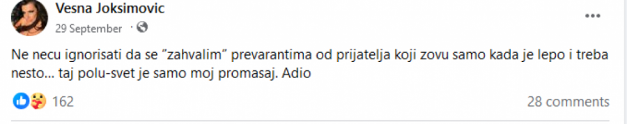 - Ne, neću ignorisati da se "zahvalim" prevarantima od prijatelja koji zovu samo kada je lepo i treba nešto… taj polusvet je samo moj promašaj. Adio! - napisala je Vesna a potom je usledila još jedna objava.