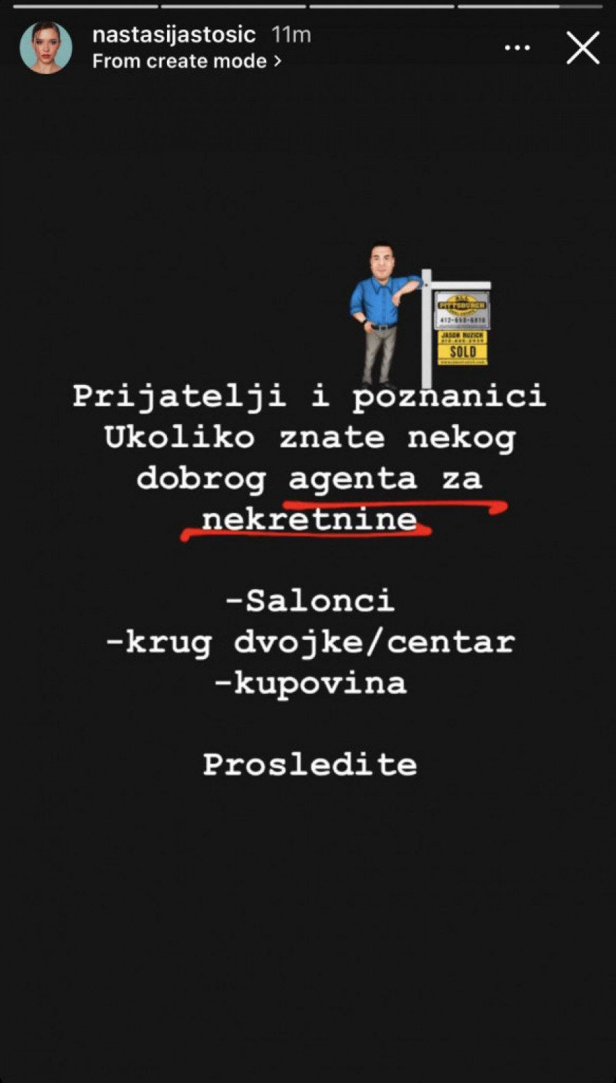 Naime, Nastasija je objavila da traži agenta za nekretnine koji bi pomogao prilikom kupovine stana u centru Beograda.