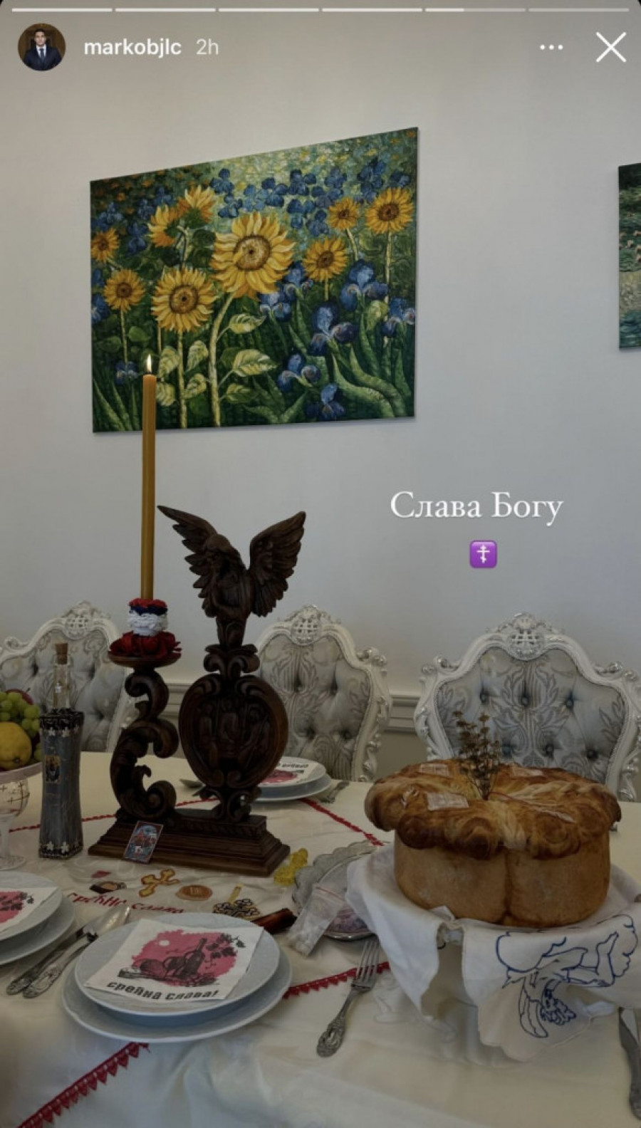 „Slava Bogu“, napisao je na ćirilici uz fotografiju na kojoj vidimo sveću u izrezbarenom svećnjaku sa likovima svetaca i anđelom, slavski kolač, elegantno posuđe sa salvetama na kojima piše „Srećna slava“, posudu sa voćem...