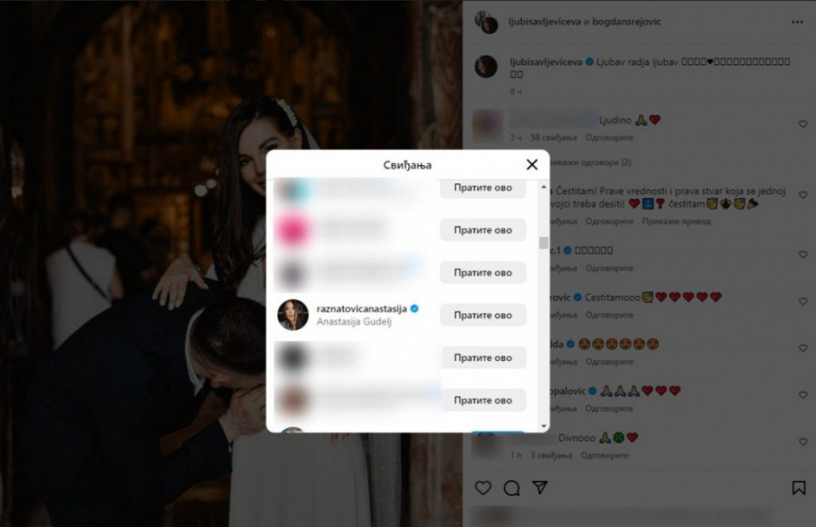 Intimna ceremonija venčanja odigrala se u manastiru Gračanica u prisustvu rođaka i bliskih prijatelja, a mlada je na sebi imala prelepu belu venčanicu širokog kroja.