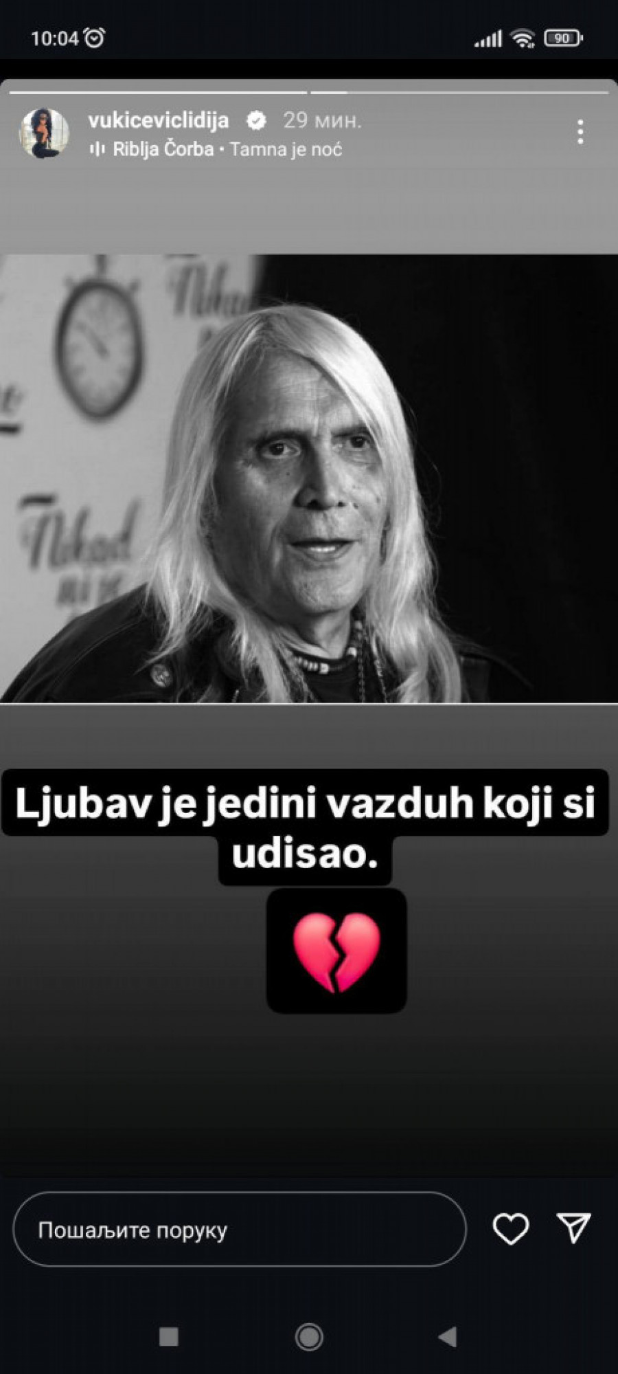 - Ljubav je jedini vazduh koji si udisao - napisala je dramska umetnica uz emotikon slomljenog srca.