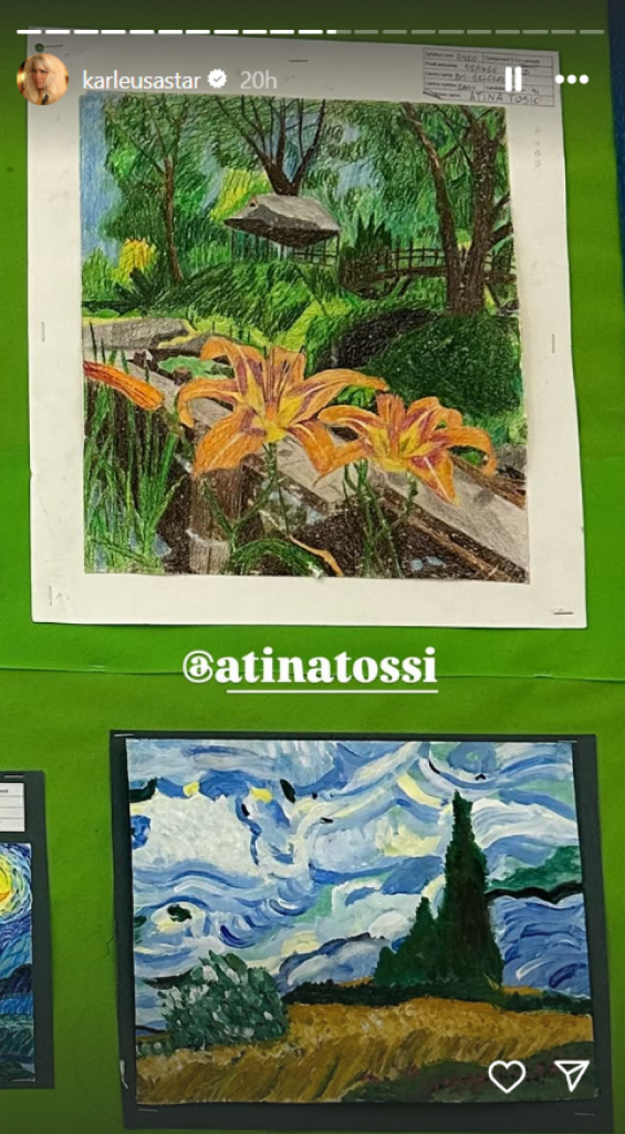 Na fotografiji se vidi čitav niz pažljivo oslikanih crteža, uključujući slike prirode, cvetnih motiva i replike poznatih umetničkih dela poput Van Gogove „Zvezdane noći“. Svaka slika odiše pažnjom prema detaljima i izražava zavidan umetnički potencijal.