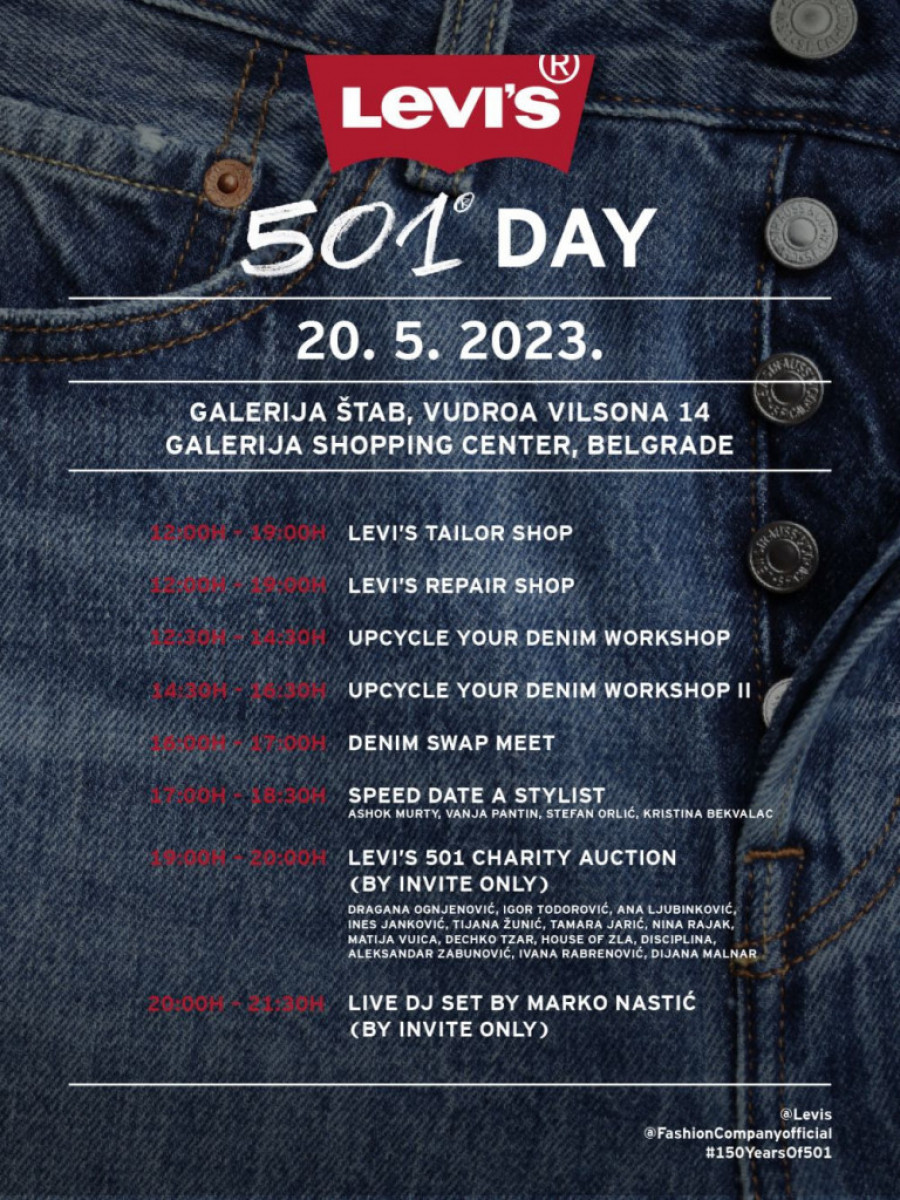 Od 20. do 21. maja 2023. godine u galeriji Štab u prizemlju šoping centra Galerija, imaćete priliku da se upoznate sa istorijom brenda Levi’s i modela 501®, da učestvujete u upcycling radionicama, dobijete savete vodećih srpskih stilista, te da učestvujete u razmeni džinsa i drugim zanimljivim aktivnostima.