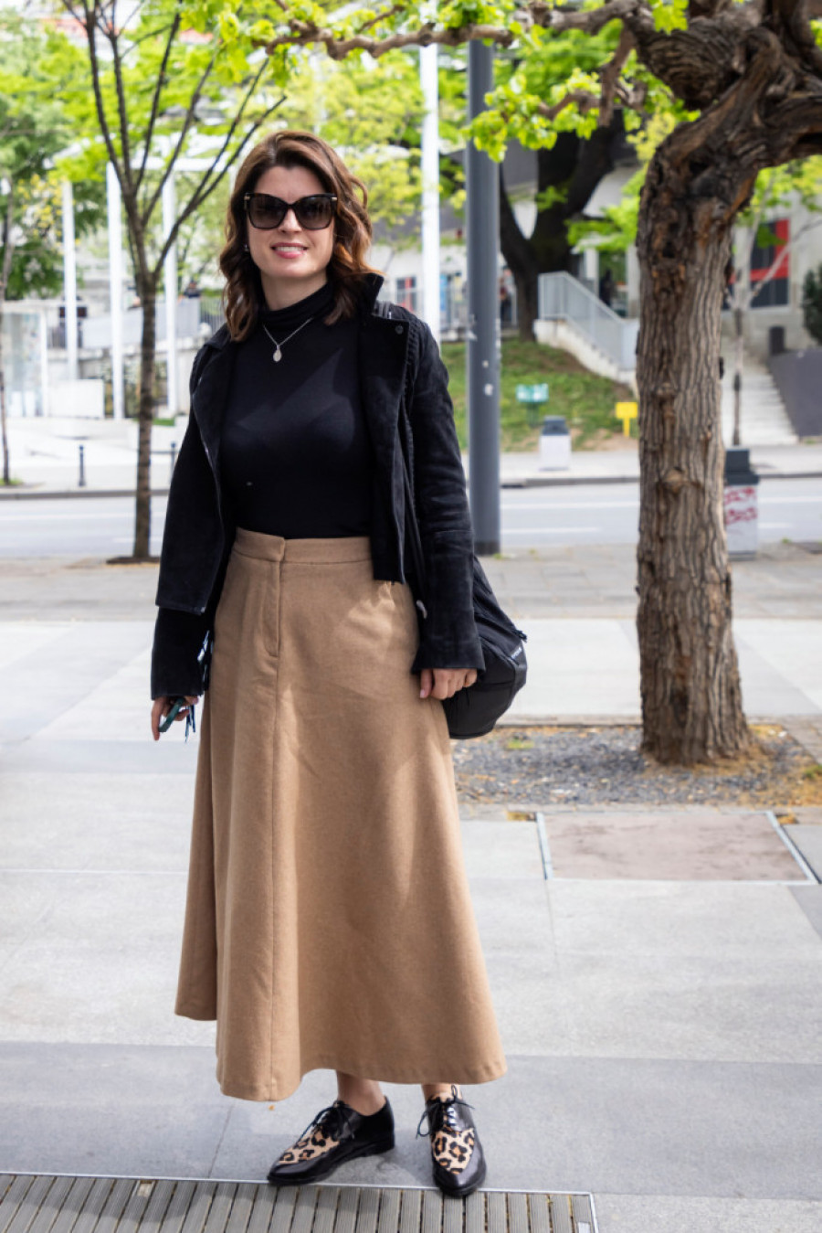 Crna majica i kratka jakna u istoj boji savršeno su se uklopili sa maksi suknjom u nijansi peska i ravnim cipelama sa leopard motivom.