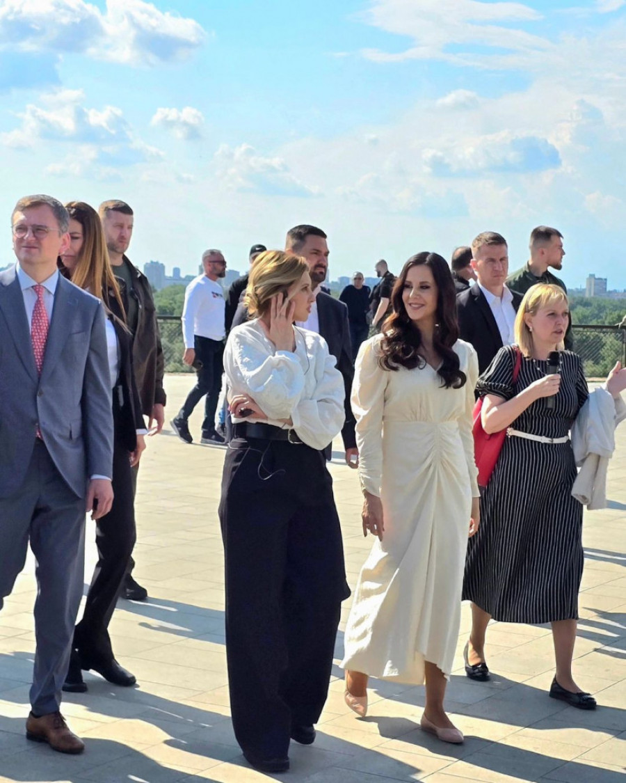 Prva dama Ukrajine i sama se opredelila za belu boju, s tim što je iskombinovala belu bluzu i široke crne pantalone visokog struka.