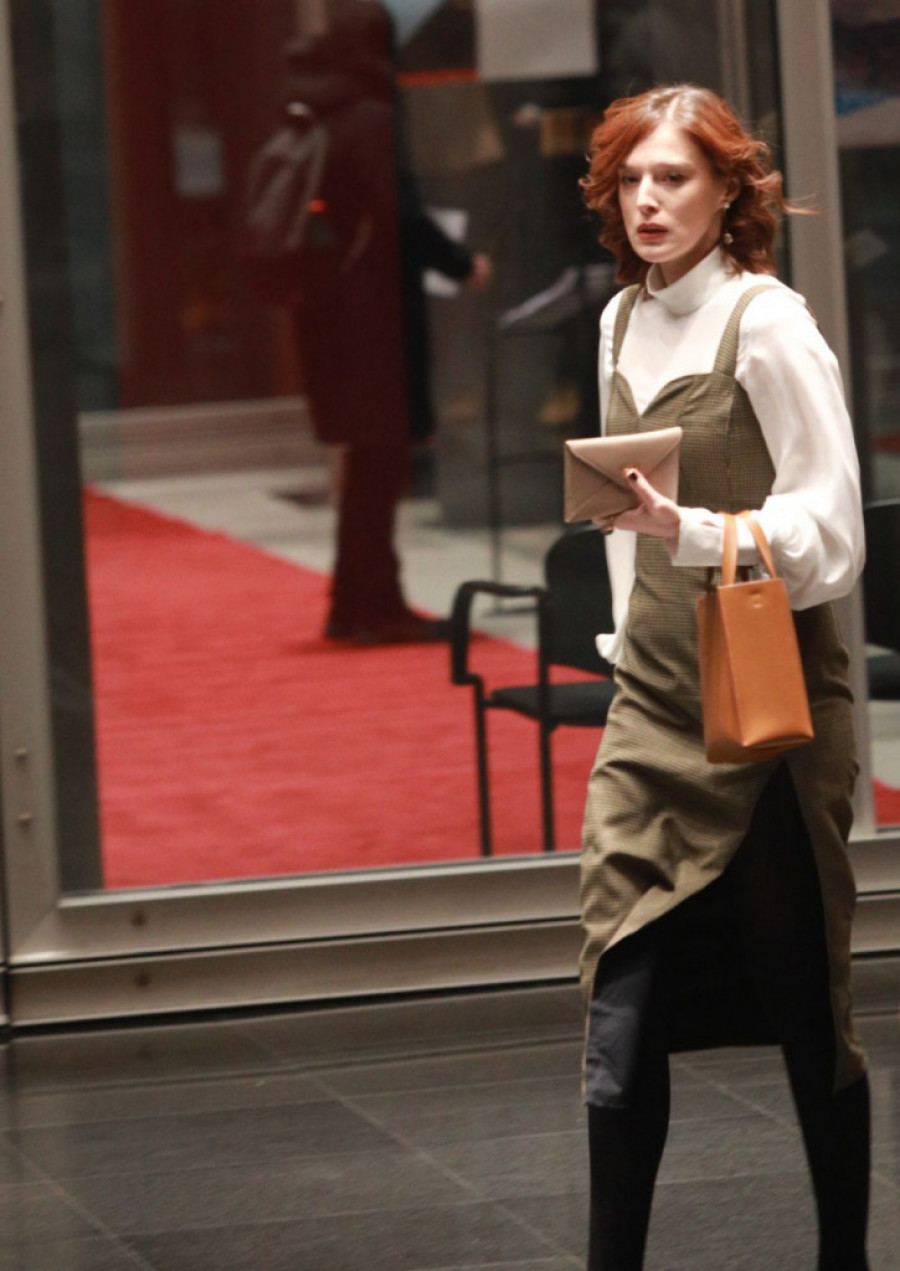 Zimsku haljinu neobičnog kroja uklopila je sa belom rolkom i visokim čizmama. I još jednom se pokazala istinitost modnog pravila – manje je više.