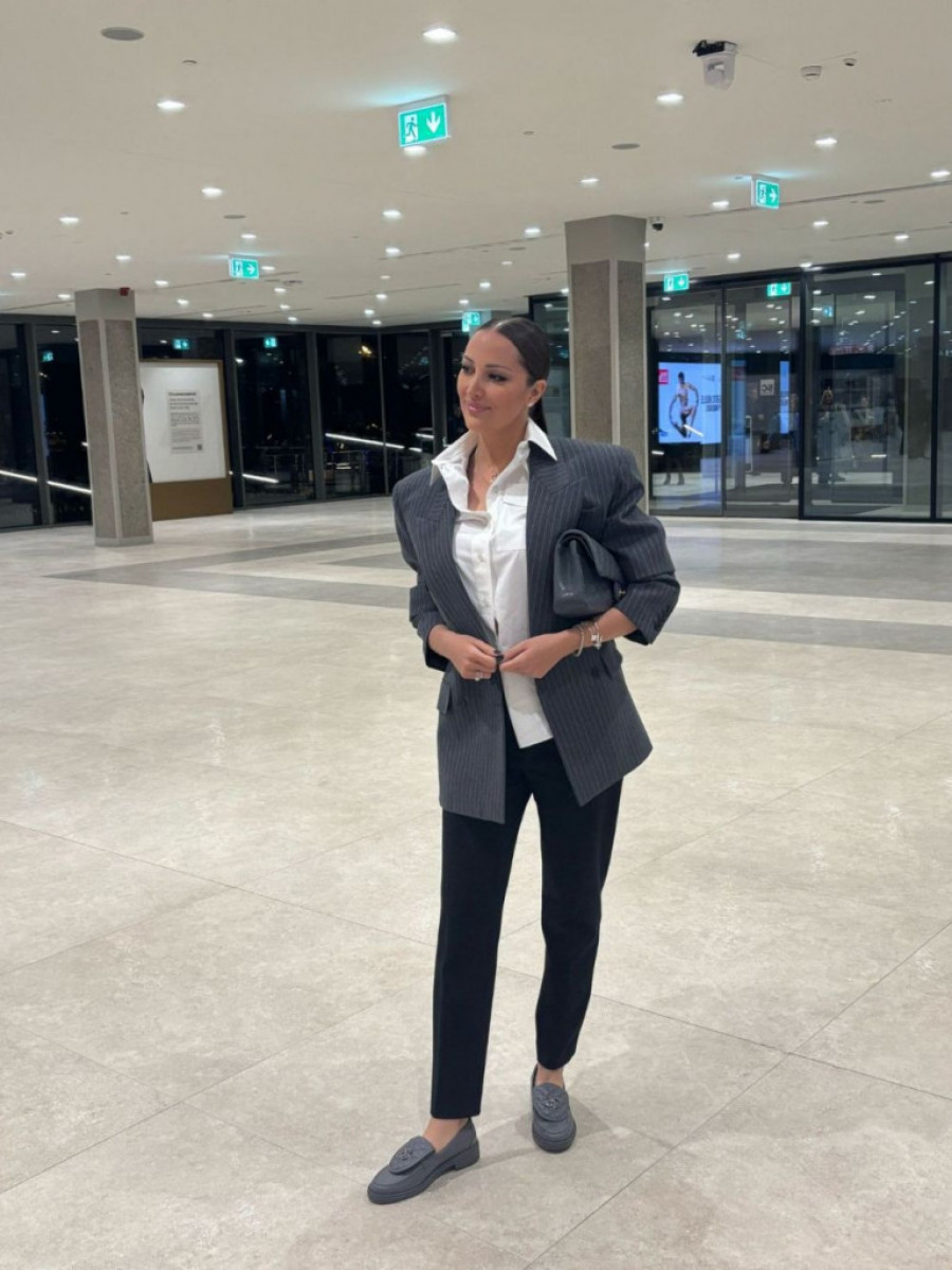 Za koncert Marije Šerifović izabrala je kežual varijantu: crne pantalone, belu košulju i sivi sako.