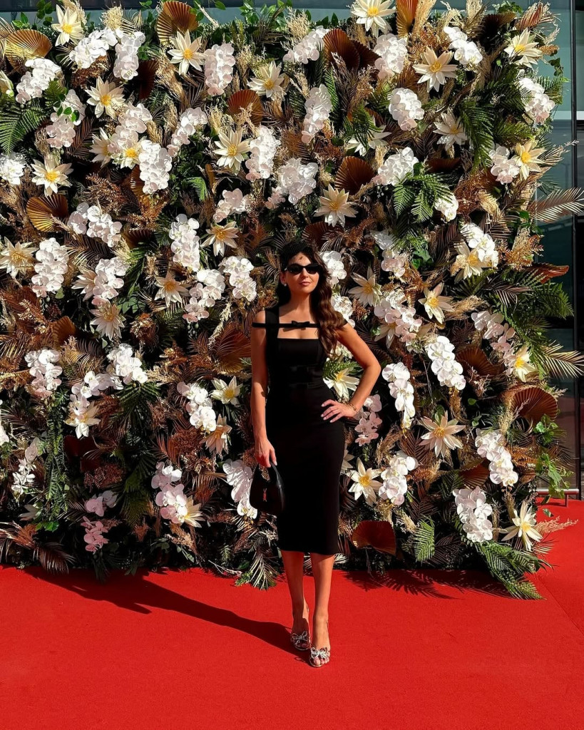 Za ovu priliku odabrala je malu crnu haljinu čiji kroz savršeno prati liniju tela, ističući njenu ženstvenu siluetu. Decentni detalj na dekolteu uneo je dašak sofisticiranosti i dodatne elegancije.