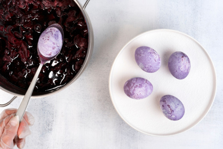 Ovaj potpuno prirodan način ukrašavanja jaja zahteva samo flašu crnog vina. Uspite ga u šerpu, ubacite jaja i prokuvajte ih. Rezultat ‒ tamna bordo boja sa šljokičastim finišem!