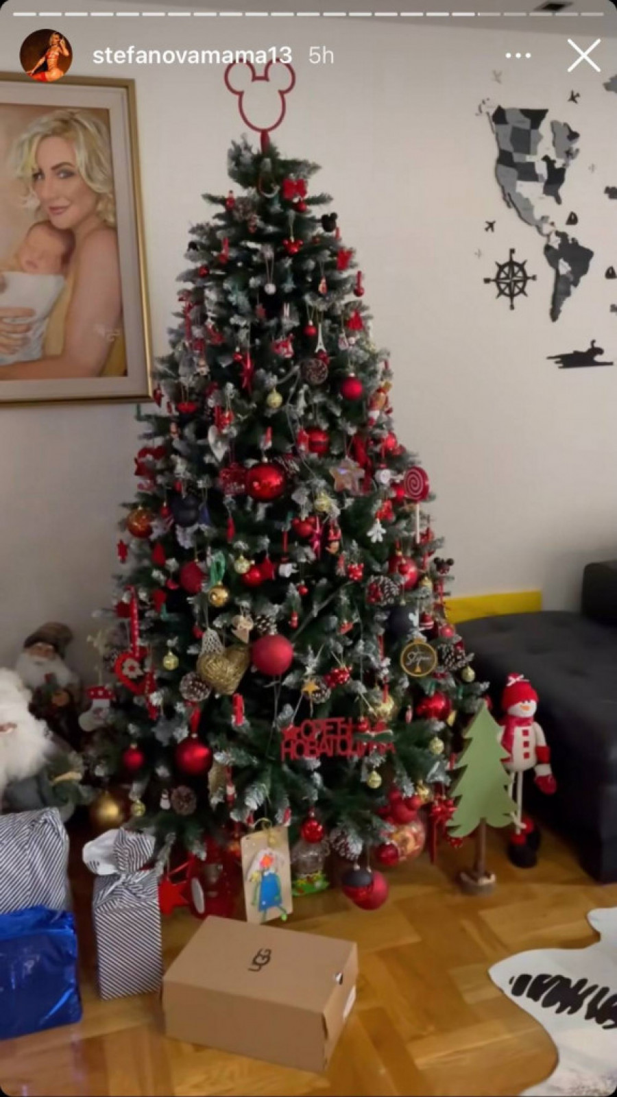 Na jelki mogu se videti i sitniji detalji – mali Sneško Belić, replika Ajfelove kule, zlatno zvonce, i medvedići, a na samom vrhu jelke stoji poseban ukras – umesto zvezde Miki Maus, kog je sigurno izabrao njen sin.