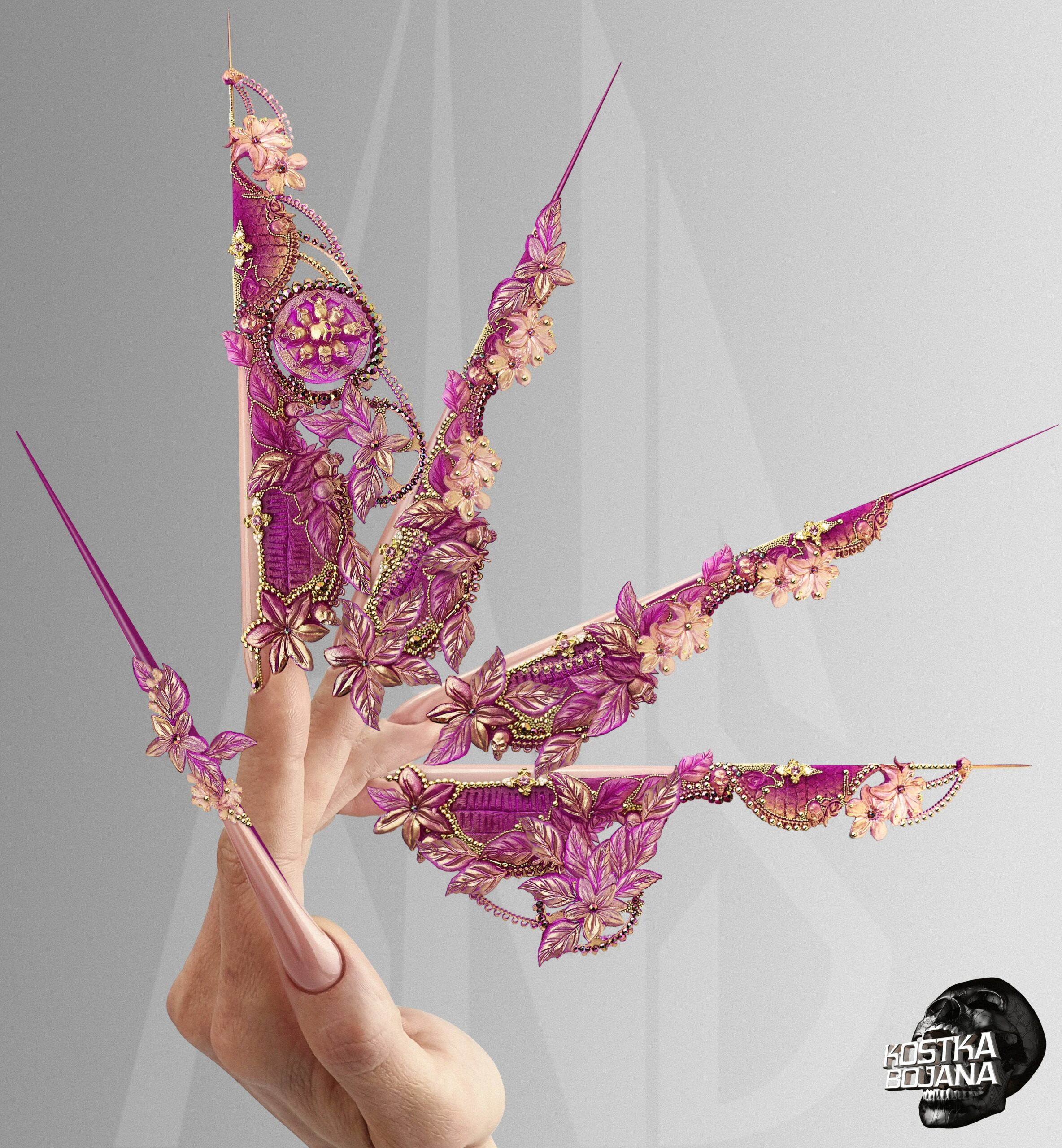 Na prvi pogled ekscentrična kombinacija baroka i gotike, sa isprepletanim motivima cvetića, čipke, barok bordure i snažnom notom futurističke gotike na koju asociraju zlatne lobanje, uklopljena na setu noktiju koji dosežu fascinantnih 30 santimetara dužine, odiše notom elegancije i luksuza, karakterističnom za Bojanine dizajne.