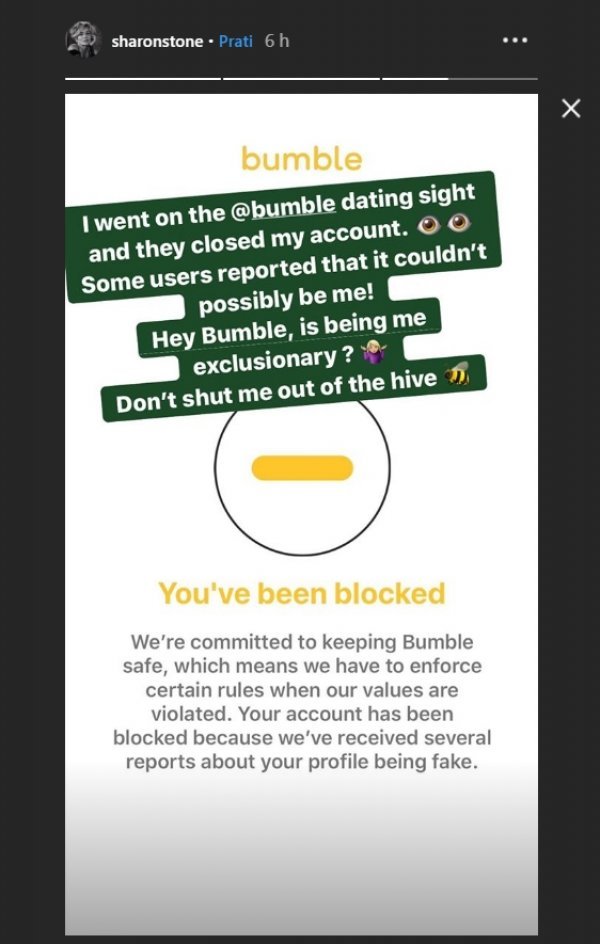 Glumica Šeron Stoun požalila se putem društvenih medija kako su joj na aplikaciji za upoznavanje i izlaske Bumble blokirali korisnički račun. Na udvarača nije dugo čekala, a javio joj se 31 godinu mlađi kolega.