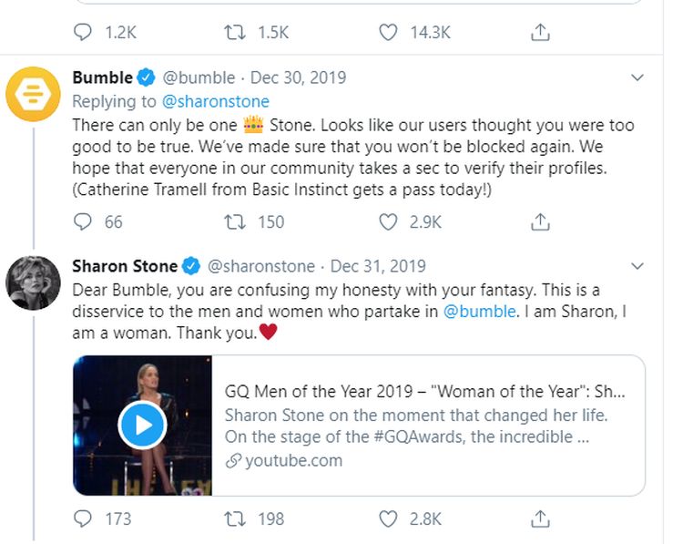 Međutim, budući da je reč o ikoni shvatamo i veliki broj naših korisnika koji su osećali da bi bilo previše dobro da bi bilo istinito kada su primetili da fotgrafija na njenom profilu nije proverena. Provera fotografije samo je jedan od mnogih načina na koji se Bumble pouzdano može povezati - odgovorili su iz Bumble-a na upit Daily Mail-a i pozvali Šeron Stoun u Ostin u njihovu košnicu na druženje uz odličnu hranu.