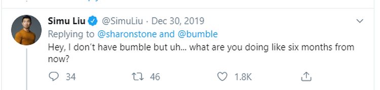 - Hej, nemam Bumble, ali uh… šta radite otprilike šest meseci od sada? - odgovorio joj je ubrzo putem Tvitera 30-godišnji kanadski glumac Simu Liu, zvezda Marvelovih filmova.