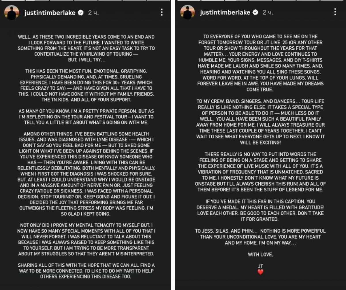 U emotivnoj objavi na društvenoj mreži Instagram (@justintimberlake), popularni pevač i bivši član NSYNC-a podelio je da mesecima trpi „ogromne bolove u živcima“, umor i simptome koji su uticali na njegovu energiju na sceni.