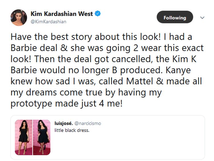 Srećom po Kardašijan, njen suprug Kanje (41) uleteo je u poslednji trenutak i spasao celu stvar. Vest je uspeo da sa Matelom napravi dogovor, te je naručio poseban prototip lutke, napravljene po liku voljene supruge i tako spasao bračnu idilu.