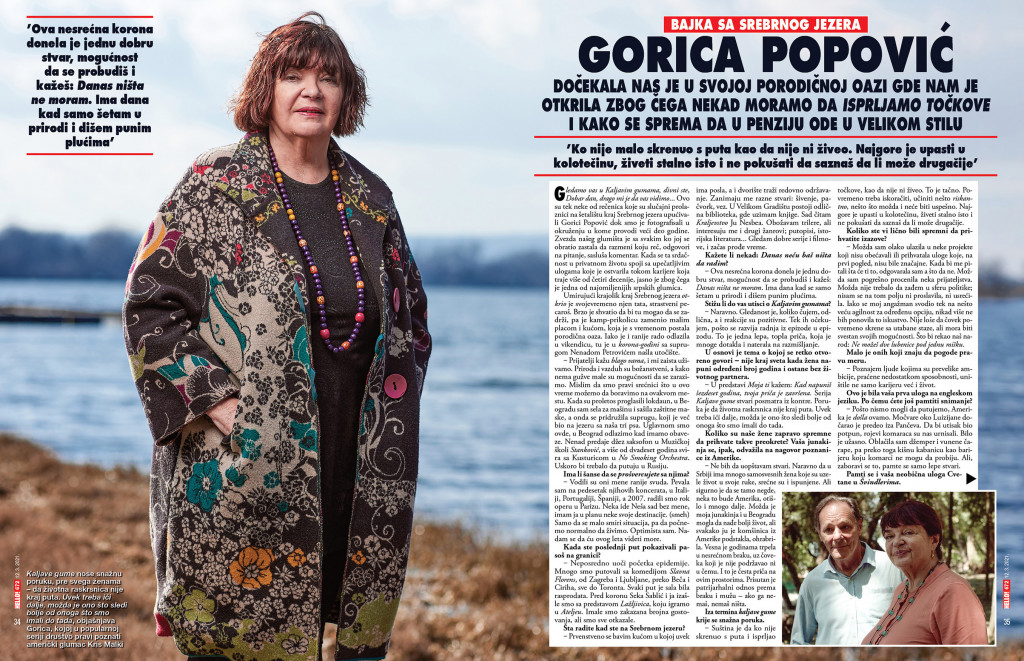 „Gledamo vas u 'Kaljavim gumama', divni ste“, „Dobar dan, drago mi je da vas vidimo“... Ovo su tek neke od rečenica koje su slučajni prolaznici na šetalištu kraj Srebrnog jezera upućivali Gorici Popović dok smo je fotografisali u okruženju u kome provodi veći deo godine. Zvezda našeg glumišta je sa svakim ko joj se obratio zastala da razmeni koju reč, odgovori na pitanje, sasluša komentar. Kada se ta srdačnost u privatnom životu spoji sa upečatljivim ulogama koje je ostvarila tokom karijere koja traje više od četiri decenije, jasno je zbog čega je jedna od najomiljenijih srpskih glumica.