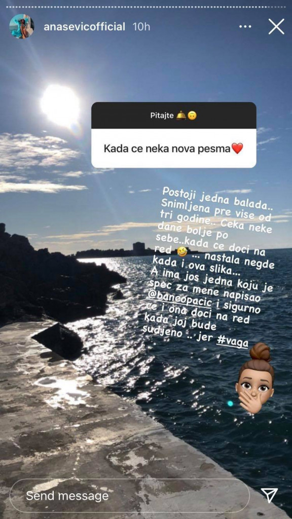 Sada je otkrila da ima dve pesme koje čekaju neke bolje dane, ali da će se sigurno vratiti pevanju jer je to ono što je pored porodice čini najsrećnijom.