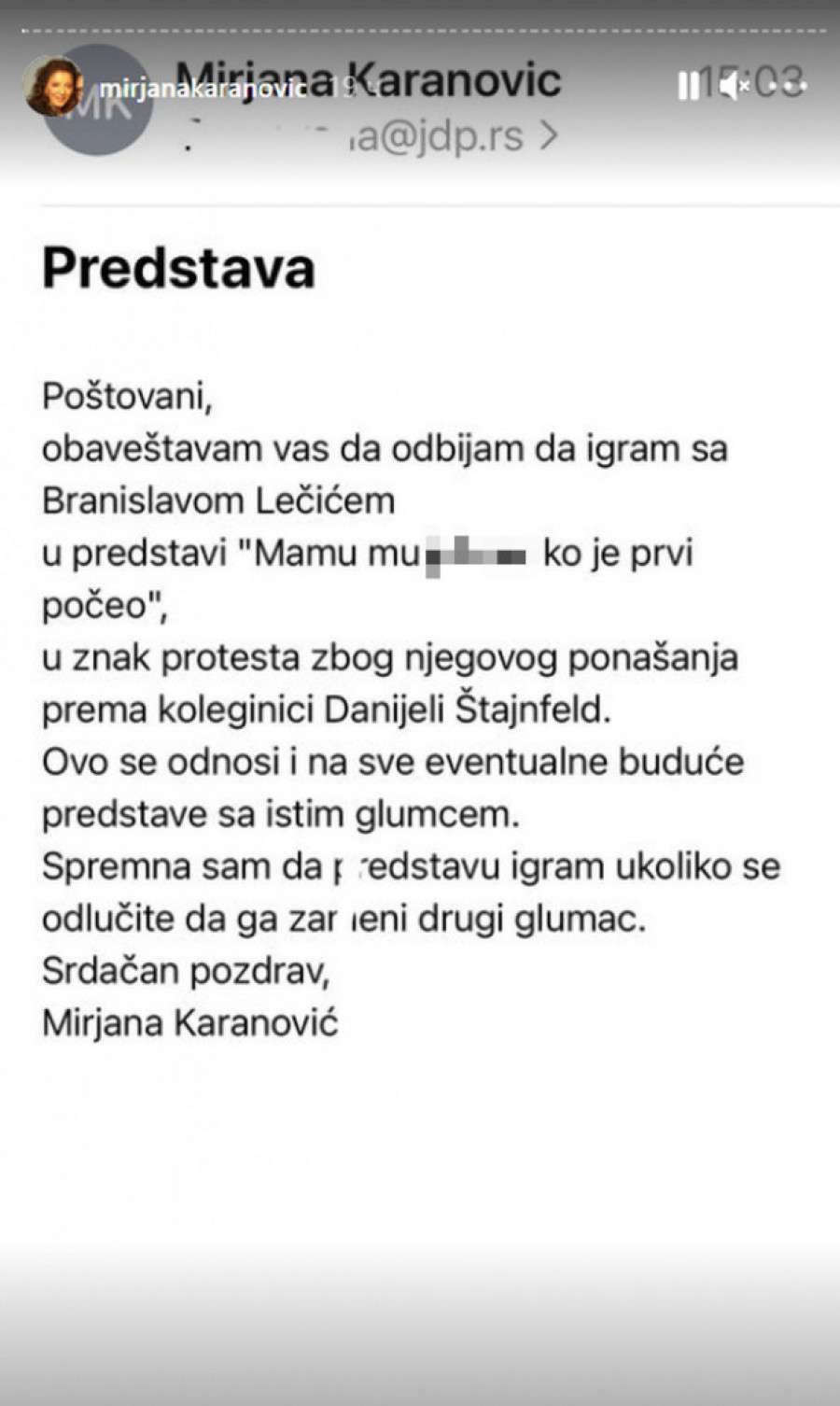 - Poštovani obaveštavam vas da odbijam da igram sa Branislavom Lečić u predstavi "Mamu mu je*em ko je prvi počeo", u znak protesta zbog njegovog ponašanja prema koleginici Danijeli Štajnfeld. Ovo se odnosi i na sve eventualne buduće predstave sa istim glumcem. Spremna sam da predstavu igram ukoliko se odlučite da ga zameni drugi glumac - objavila je Mirjana Karanović apel na svom profilu na "Instagramu".