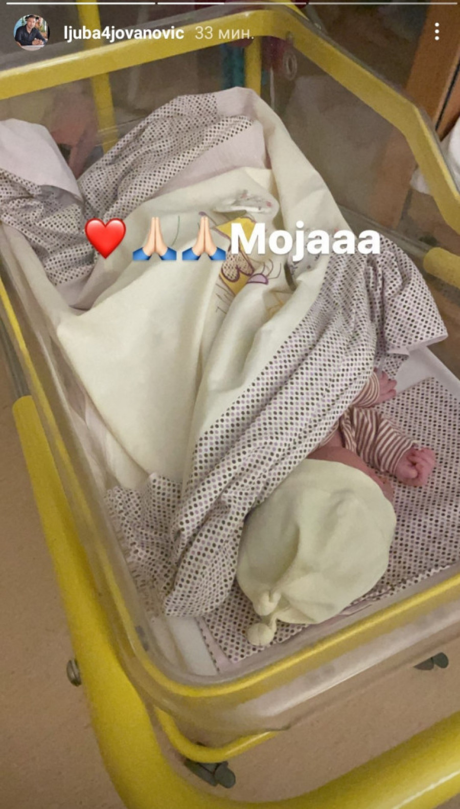 „Moja“, napisao je ponosni tata uz fotografiju ćerkice prvi put snimljene u porodilištu. Devojčica koja je na svet stigla 21. juna dobila je ime Irina.