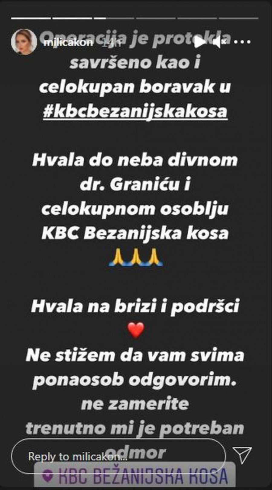 „Operacija je protekla savršeno, kao i celokupan boravak u KBC 'Bežanijska kosa'. Hvala do neba divnom dr Graniću i celokupnom osoblju. Hvala na brizi i podršci! Trenutno mi je potreban odmor.“