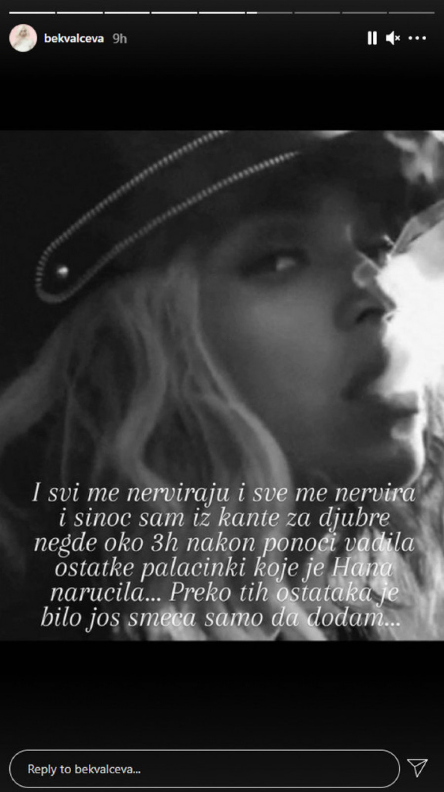 „Ovo je doslovno isterivanje đavola! Egzorcizam ljudi! I toliko žderem, to su kilogrami hrane, poludeću. Ljudi, dan 5. bez cigarete. Ovo je strašno kako se ja osećam. Jako sam nervozna, agresivna, osetljiva... Doslovno sam opasna po okolinu. I svi me nerviraju, i sve me nervira, i sinoć sam iz kante za đubre, negde oko tri časa posle ponoći, vadila ostatke palačinki koje je Hana naručila. Preko tih ostataka je bilo još smeća, samo da dodam. A ovo što sada radim, ljudi, da li je realno da mene ne mrzi da pravim puding sa plazmom i da molim Boga da mi neko ne uđe u kuhinju i, ne daj Bože, traži da podelimo! Ne želim da delim svoj desert! To me usrećuje! Ja sam emotivno rastrojena!“, pisala je Bekvalčeva kojoj je očigledno baš bilo loše.