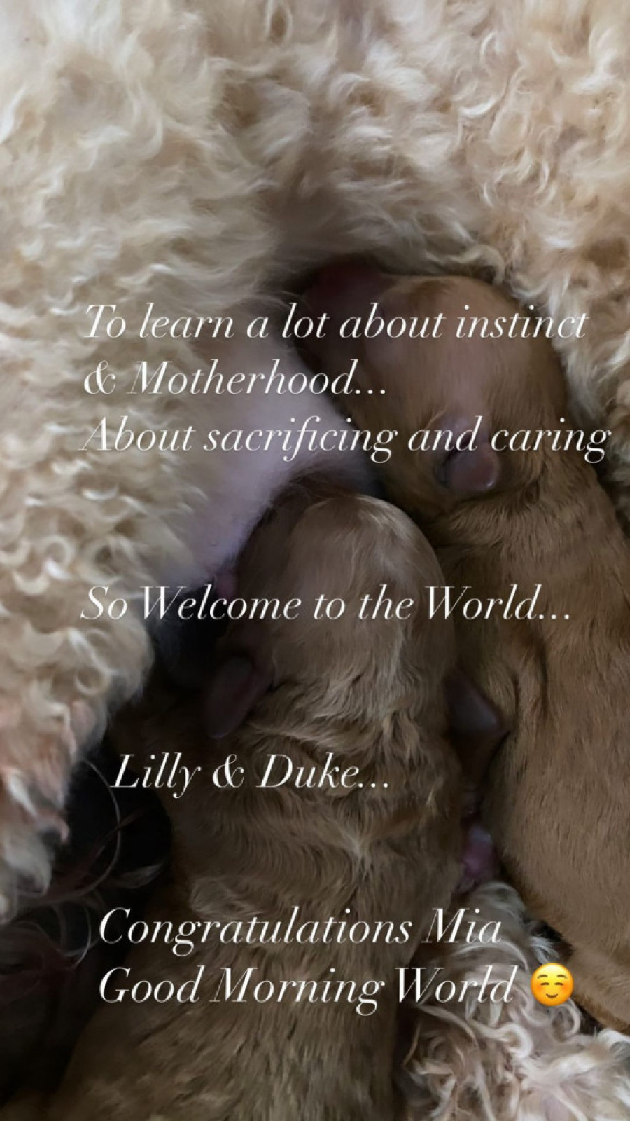 Pred zoru, oko pola pet, stiglo je prvo štene, koje je dobilo ime Lili, a potom joj se pridružio Djuk. Pop zvezda, u ovom slučaju „babica“, čak je otkrila tačno vreme kada se to dogodilo.