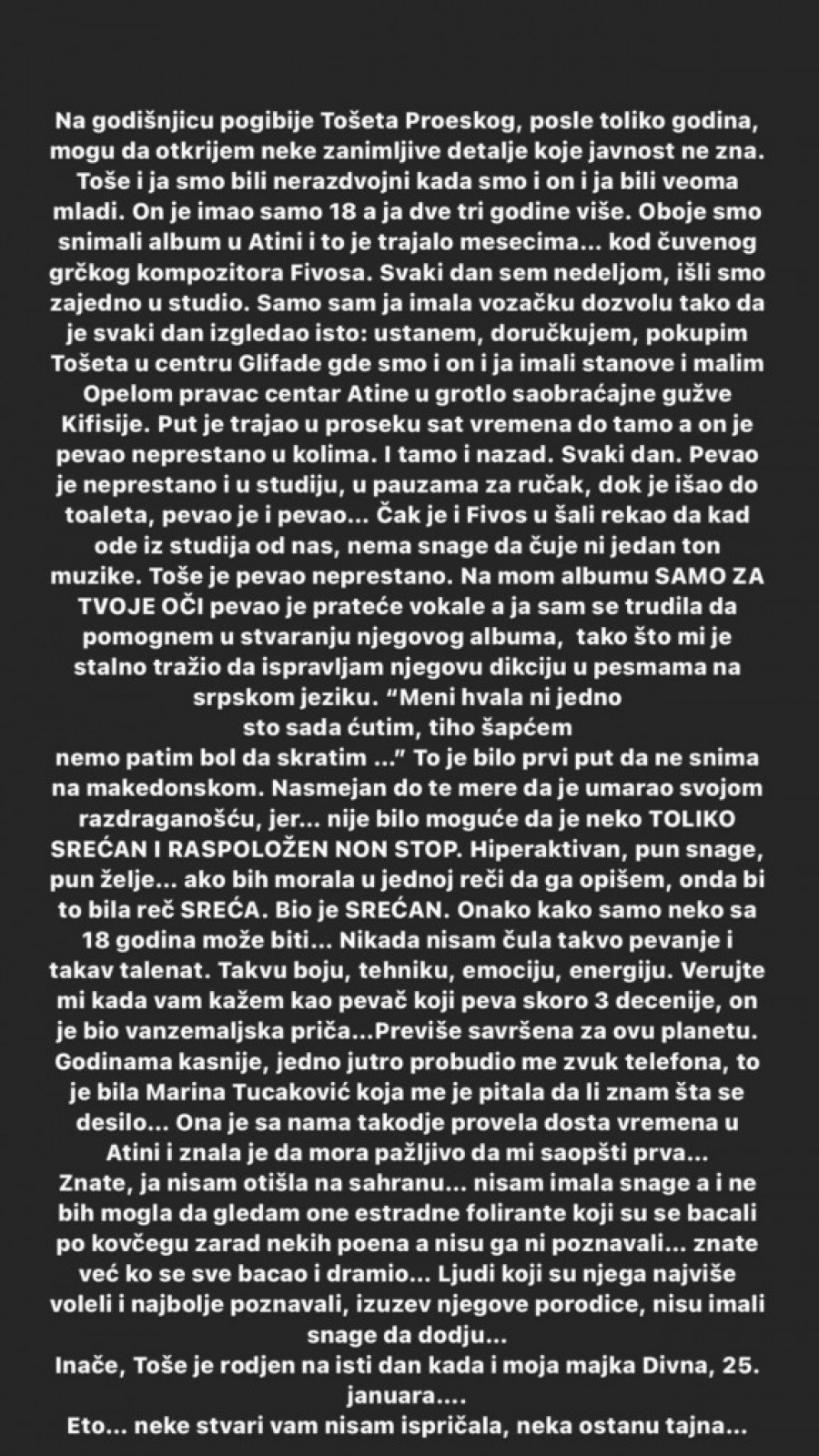 "Na godišnjicu pogibije Tošeta Proeskog, posle toliko godina, mogu da otkrijem neke zanimljive detalje koje javnost ne zna. Toše i ja smo bili nerazdvojni kada smo i on i ja bili veoma mladi. On je imao samo 18 a ja dve, tri godine više. Oboje smo snimali album u Atini i to je trajalo mesecima... kod čuvenog grčkog kompozitora Fivosa. Svaki dan sem nedeljom, išli smo zajedno u studio. Samo sam ja imala vozačku dozvolu tako da je svaki dan izgledao isto: ustanem, doručkujem, pokupim Tošeta u centru Glifade gde smo i on i ja imali stanove i malim Opelom pravac centar tine u grotlo saobraćajne gužve u Kifisije. Put je trajao u proseku sat vremena do tamo a on je pevao neprestano u kolima. Tamo i nazad. Svaki dan. Pevao je neprestano u u studiju, u pauzama za ručak, dok je išao do toaleta, pevao je i pevao... Čak je i Fivos u šali rekao da kad ode iz studija od nas, nema snage da čuje ni jedan ton muzike. Toše je pevao neprestano", napisala je Karleuša i nastavila: