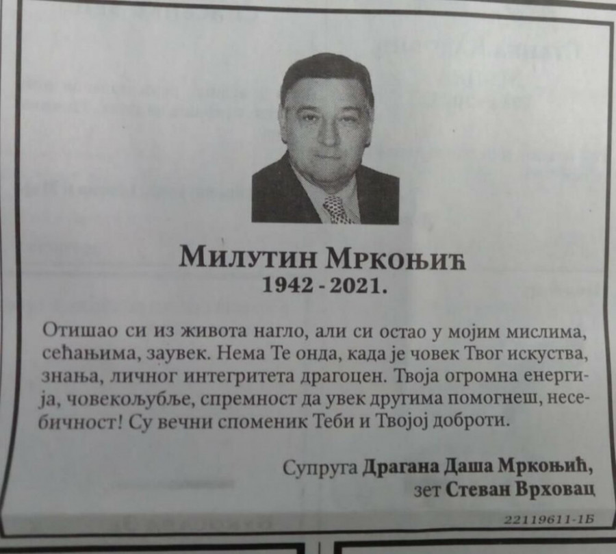 ‒ Otišao si iz života naglo, ali si ostao u mojim mislima, sećanjima, zauvek. Nema te onda kad je čovek tvog iskustva, znanja, ličnog integriteta dragocen. Tvoja ogromna energija, čovekoljublje, spremnost da uvek drugima pomogneš, nesebičnost, večni su spomenik tebi i tvojoj dobroti! ‒ reči su kojima se Daša oprostila od supruga Milutina Mrke.