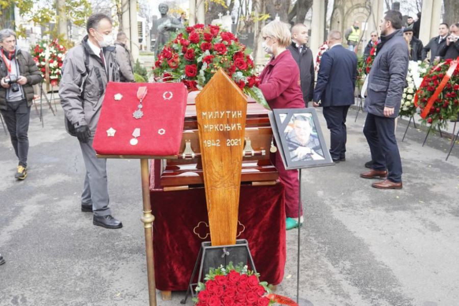 Milutin Mrkonjić sahranjen je danas u Aleji zaslužnih građana na Novom groblju u Beogradu. Ogroman ljudi došao je da isprati nekadašnjeg ministra i velikog politača na poslednji počinak. Nekoliko sati pre, održana je i komemoracija na kojoj su govore držali predsednik Aleksandar Vučić, Ivica Dačić i Vlade Divac.