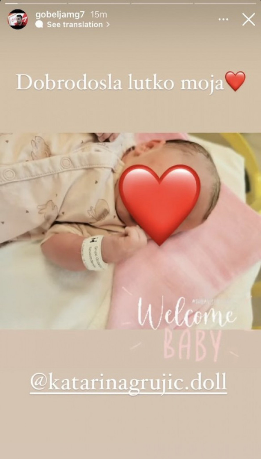 Pevačica Katarina Grujić i fudbaler Marko Gobeljić pre dva dana postali su roditelji devojčice Katje, koju je ponosni tata, čim je došla na svet, pokazao na Instagramu.