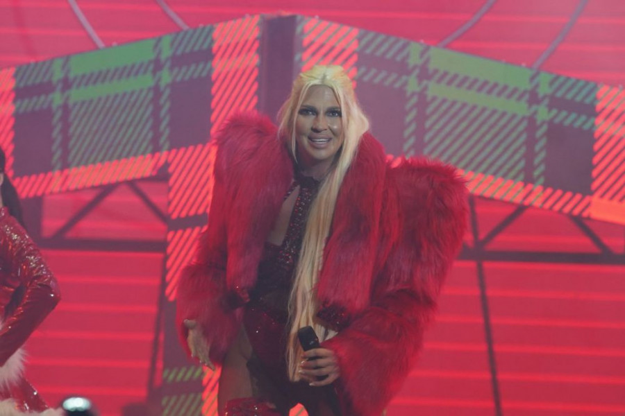 Karleuša se za drugi blok numera presvukla u crveni provokativan kostim, preko koga je nosila je bundu.