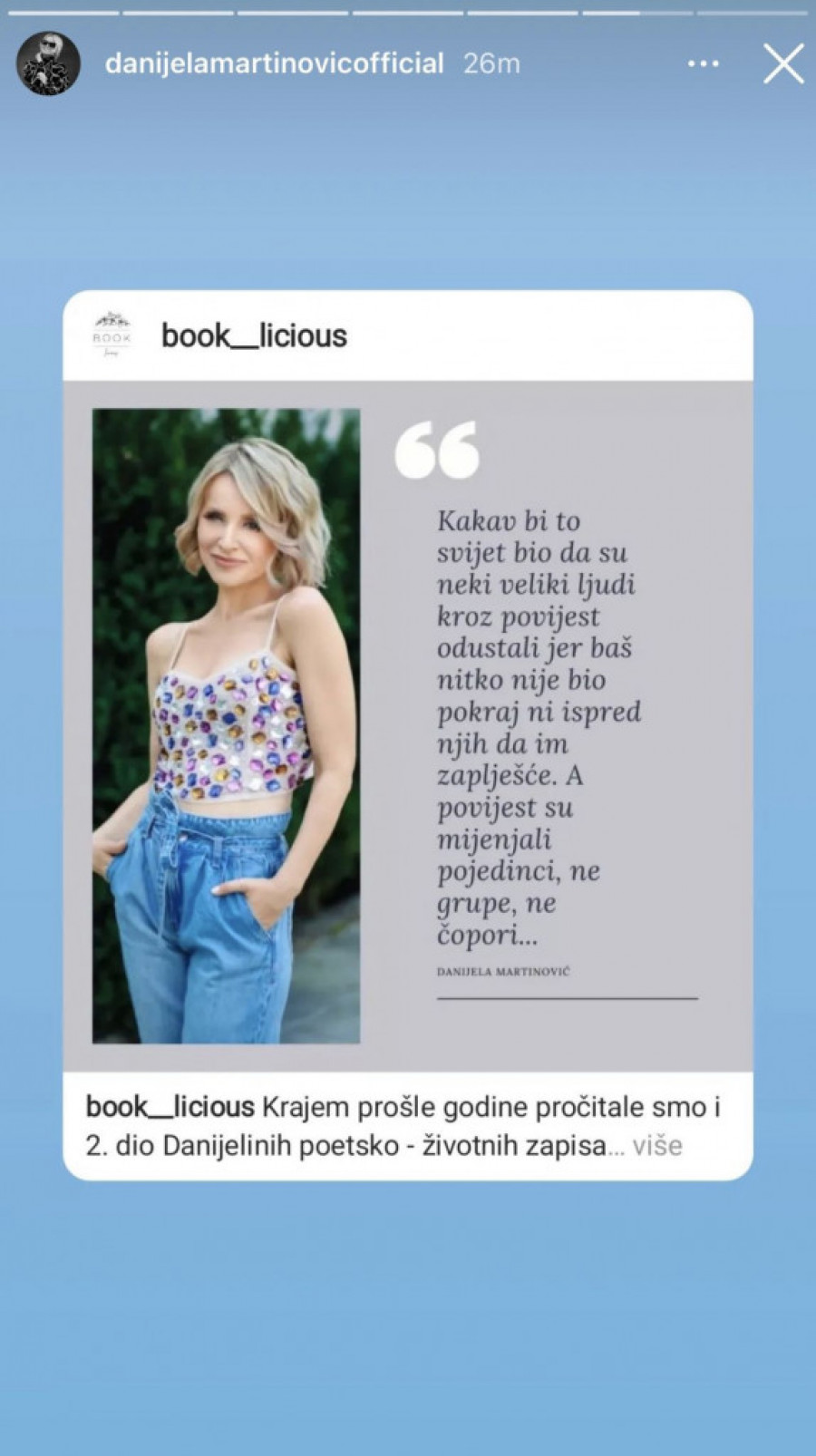 "Kakav bi to svet bio da su neki veliki ljudi kroz istoriju odustali jer baš niko nije bio pokraj ni ispred njih da im aplaudira. A istoriju su menjali pojedinci ne grupe, ne čopori...", Danijelina je jasna poruka da ona ne odustaje i čvrsto stoji sa obe noge na zemlji verna svojim snovima i željama.