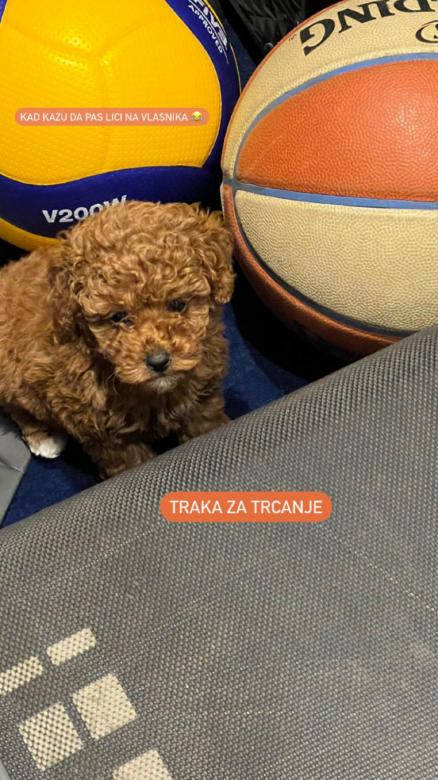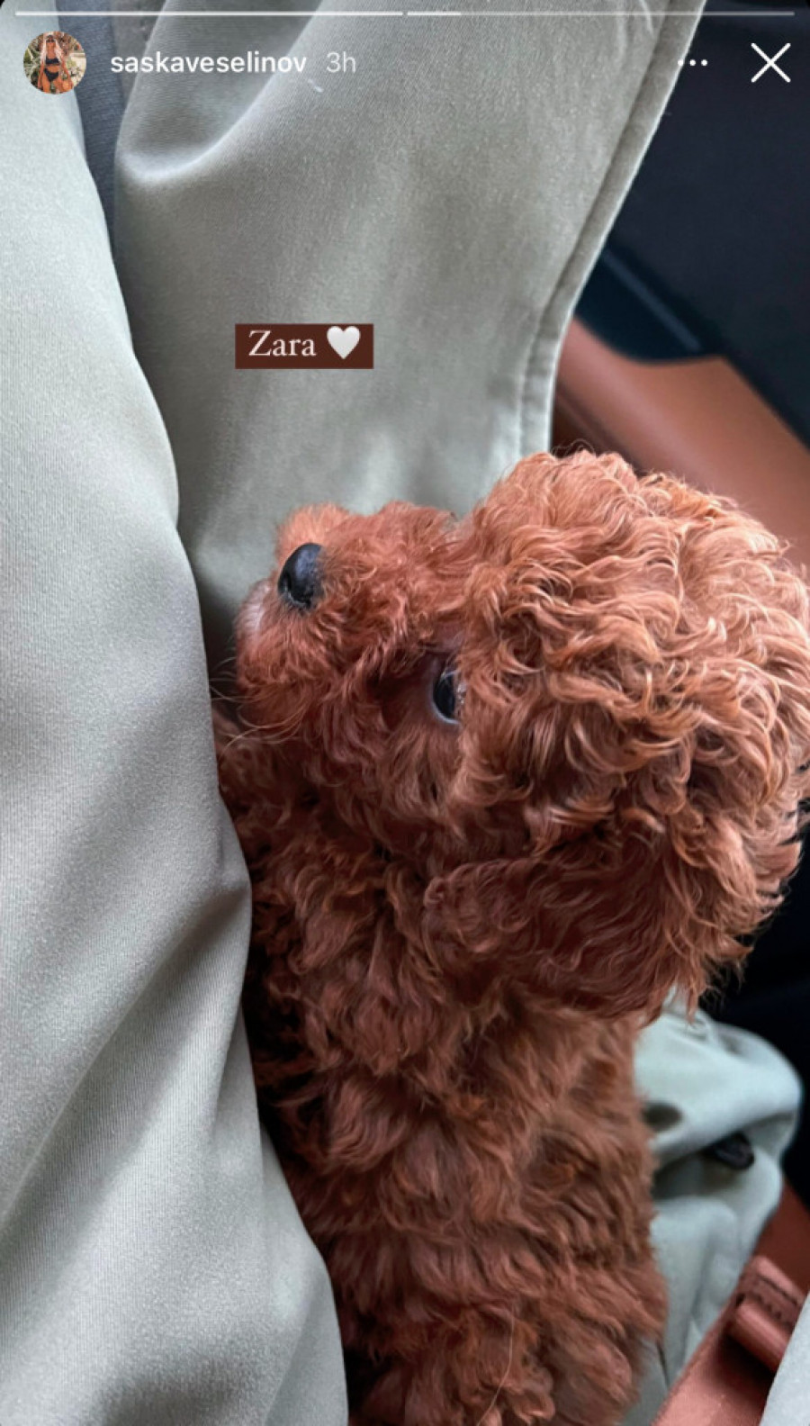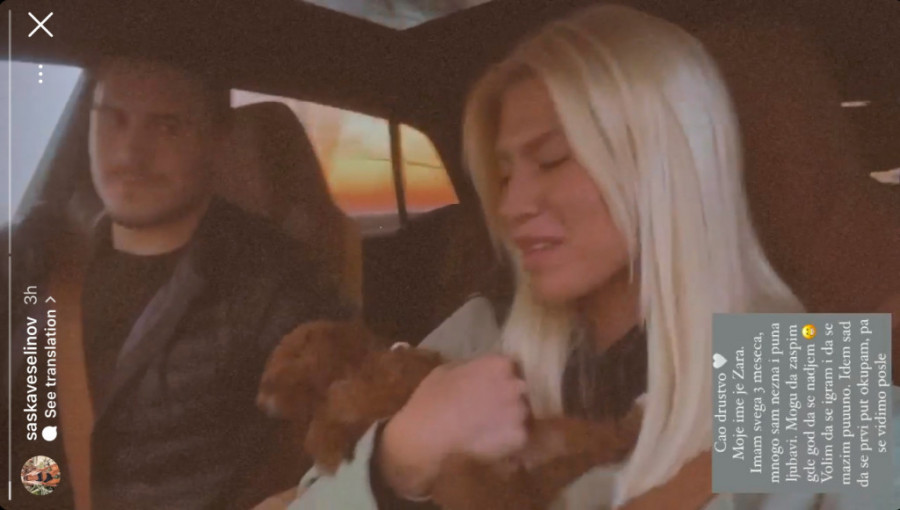 „Ćao, društvo! Imam samo tri meseca, mnogo sam nežna i puna ljubavi. Mogu da zaspim gde god se nađem. Volim da se igram i da se mazim, puuuno. Idem sad da se prvi put okupam, pa se vidimo posle“, napisala je Saška pored fotografije iz automobila, nastale verovatno kada su ona i Đorđe odneli štene kući.