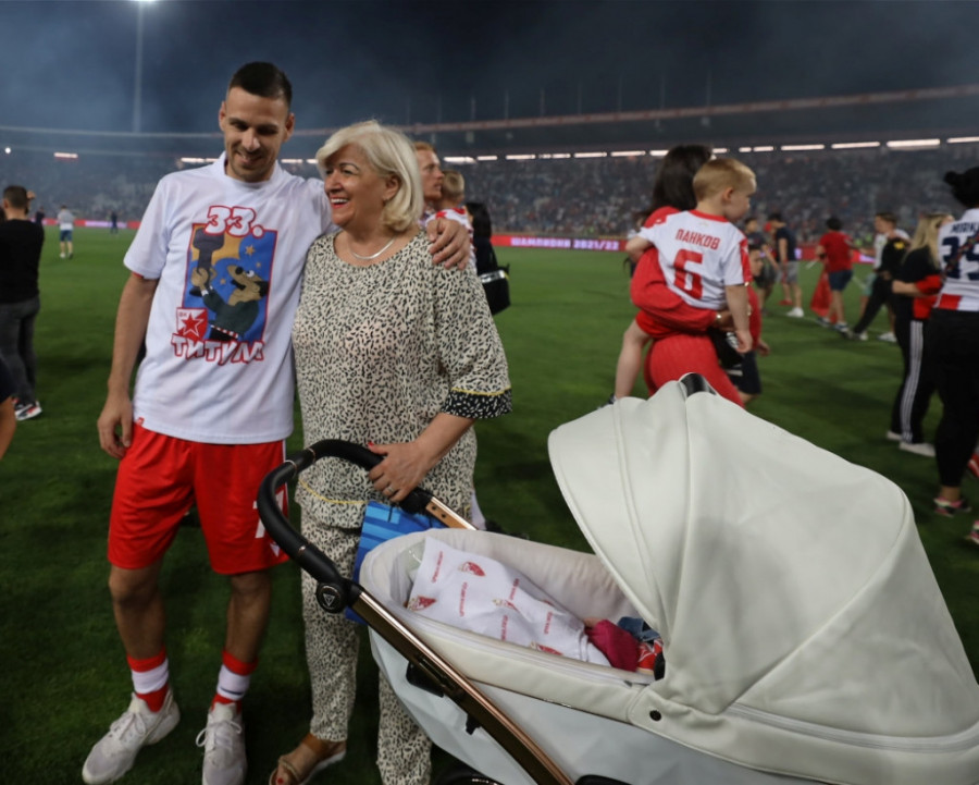 Uživajući u tatinom zagrljaju, preslatka Katja oduševljeno je posmatrala sve što se oko nje dešava. Glasna muzika i skandiranje navijača ni najmanje nisu uplašili devojčicu već je kao svaka buduća zvezda uživala u svetlima reflektora.
