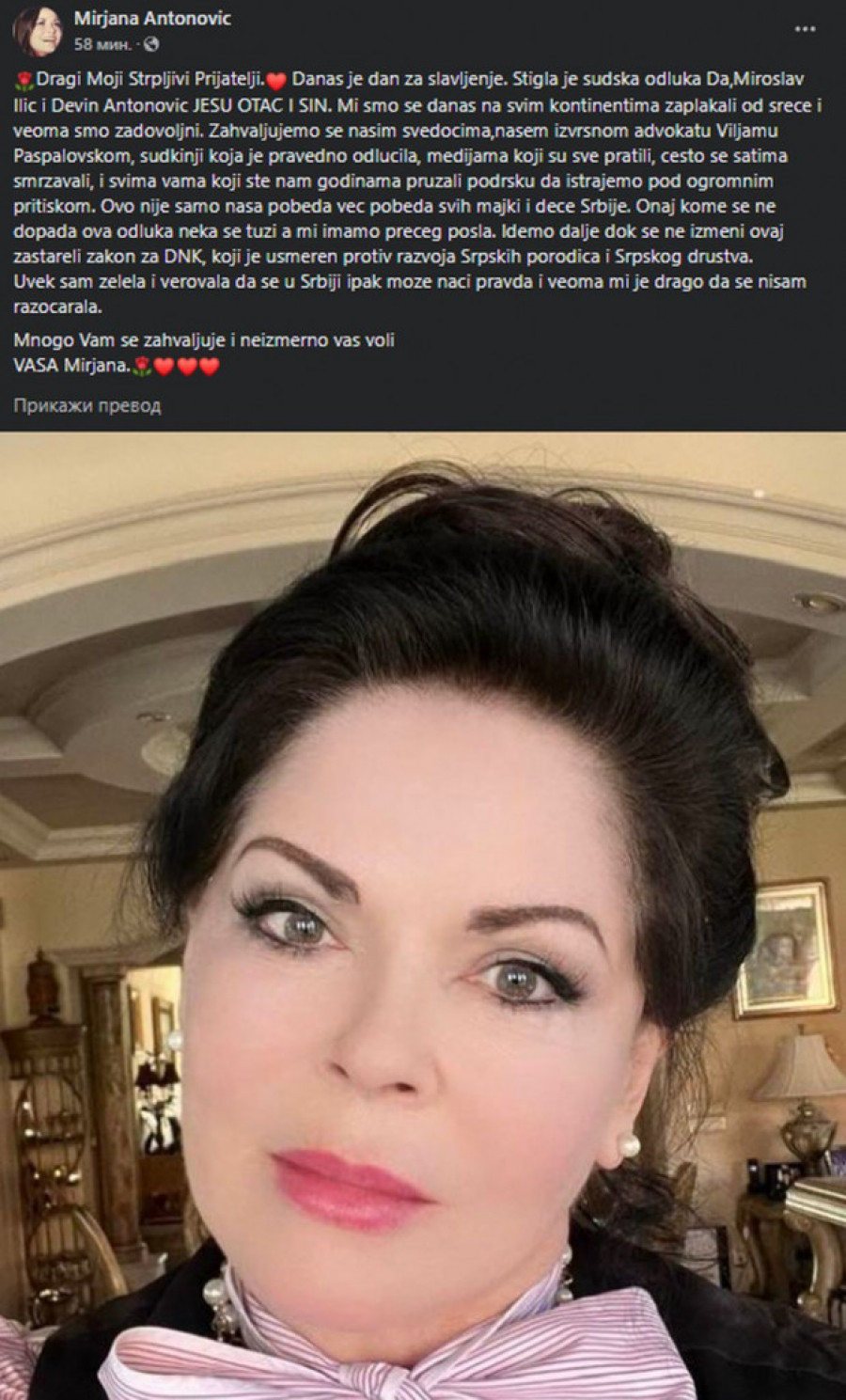 - Dragi moji strpljivi prijatelji, danas je dan za slavljenje. Stigla je sudska odluka da Miroslav Ilić i Devin Antonović jesu otac i sin. Mi smo danas na svim kontinentima zaplakali od sreće i veoma smo zadovoljni. Zahvaljujemo se našim svedocima, našem izvršnom advokatu Viljamu Paspalovskom, sutkinji koja je pravedno odlučila, medijima koji su sve pratili, često se satima smrzavali, i svima vama koji ste nam godinama pružali podršku da istrajemo pod ogromnim pritiskom - napisala je Mirjana i dodala: