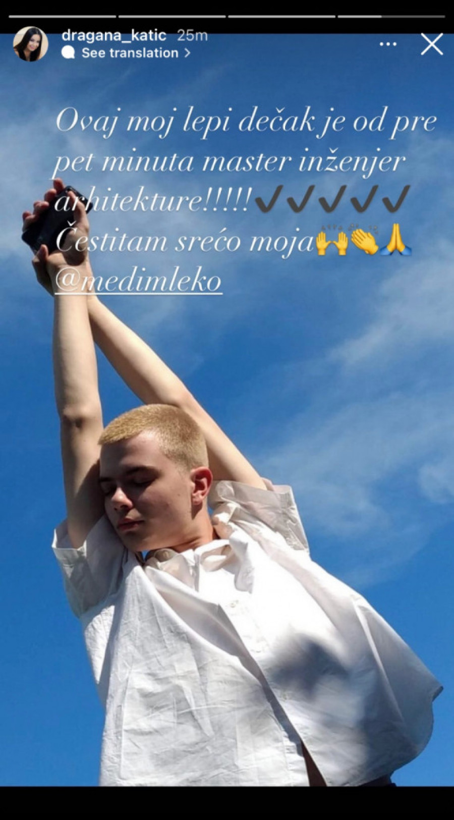 „Ovaj moj lepi dečak je od pre pet minuta master inženjer arhitekture. Čestitam, srećo moja!“