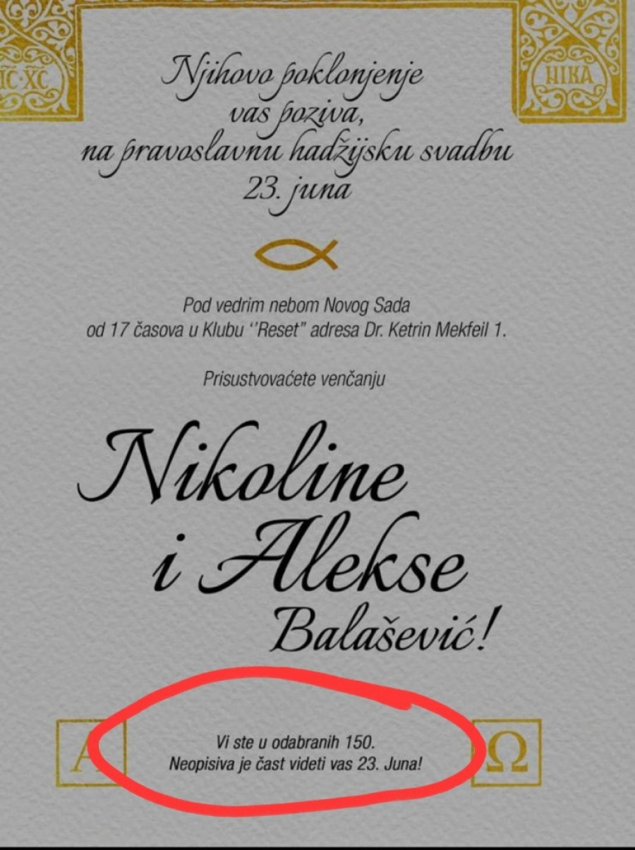 „Njihovo poklonjenje vas poziva na pravoslavnu hadžijsku svadbu pod vedrim nebom Novog Sada. Vi ste u odabranih 150. Neopisiva je čast videti vas 23. juna!“