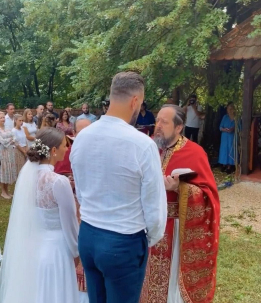Mlada je blistala u jednostavnoj beloj venčanici ukrašenoj čipkom, dok se mladoženja odlučio za zanimljivu košulju sa etno motivima.