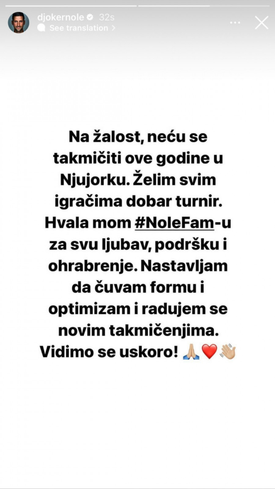 "Na žalost, neću se takmičiti ove godine u Njujorku. Želim svim igračima dobar turnir. Hvala mom #NoleFam-u za svu ljubav, podršku i ohrabrenje. Nastavljam da čuvam formu i optimizam i radujem se novim takmičenjima. Vidimo se uskoro", napisao je Novak Đoković na svojim profilima na društvenim mrežama.